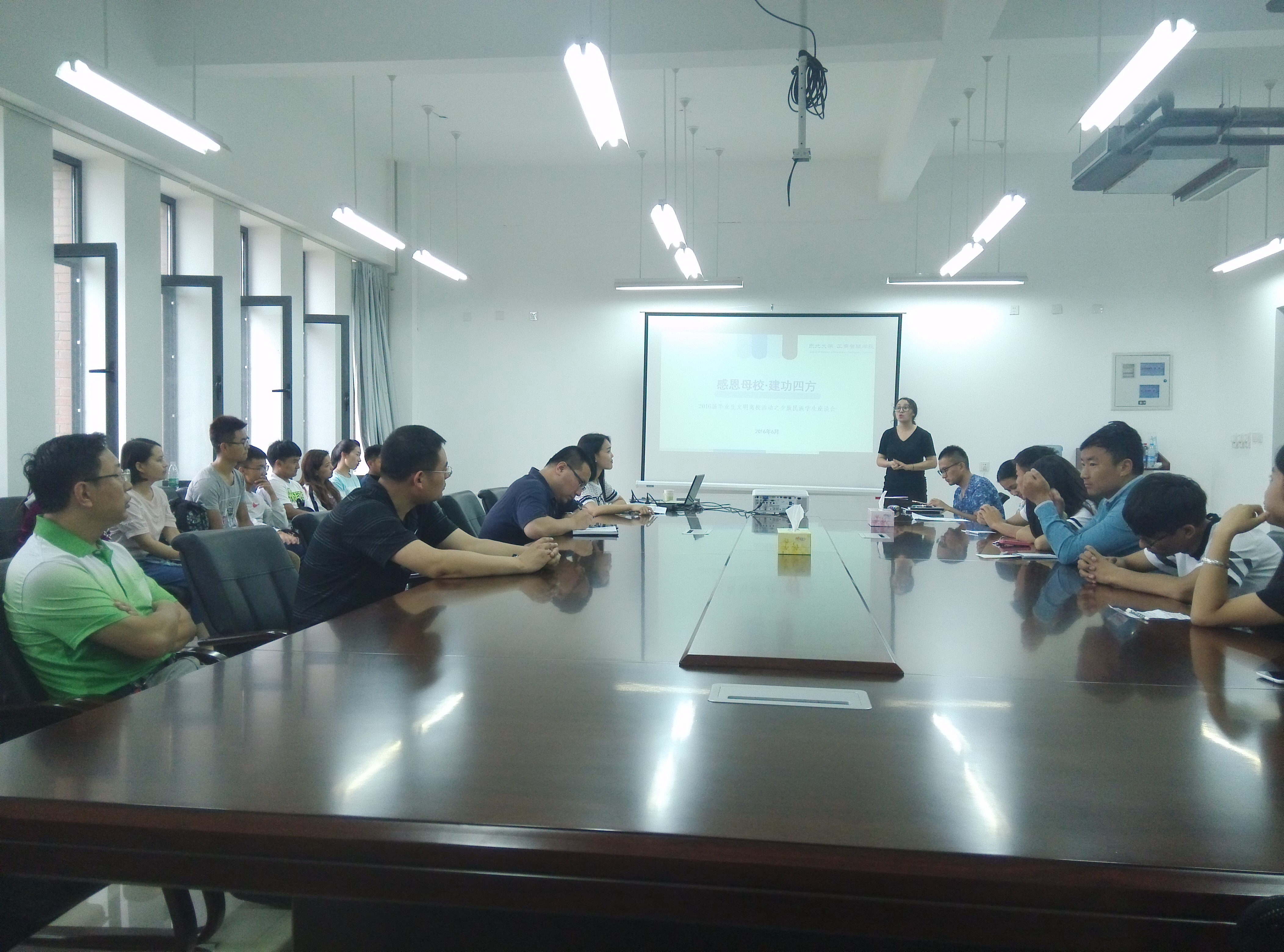 会议结尾,严立宁老师对2016届少数民族学生的在校表现给予肯定,祝贺大家顺利完成学业,并希望同学们能够秉承麻豆网 校训精神,勇于承担社会责任,建设家乡和祖国,同时与低年级的少数民族学生交流,鼓励大家以此为榜样,做好学业规划。