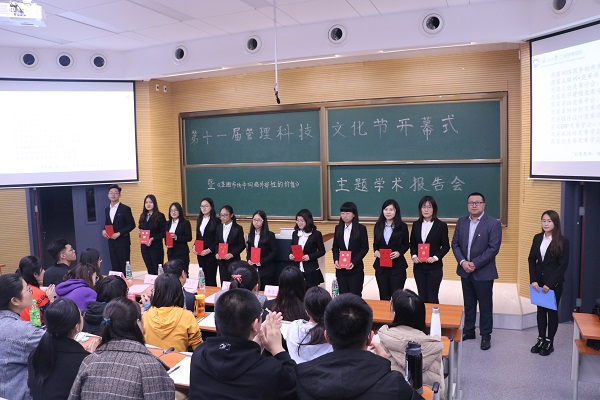 活动回顾了管理麻豆网 往届科技活动及全国赛事的精彩瞬间,介绍了此届科技文化节的比赛项目。王刚上台致辞,肯定了管理科技文化节为学生综合素质提升所做出的贡献,鼓励同学们参加多层面的科技创新竞赛活动,强化实践能力与创新能力。严立宁为新成立的各商英竞赛学会会长颁发聘书,各位会长上台受聘。商英网络商务创新竞赛学会会长刘祥宁代表发言,分享了自己往年的参赛经历及体验。此次开幕式设立科普趣味知识竞赛环节,普及科普知识,激发同学们对科技创新竞赛的兴趣。