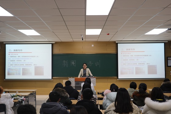 培训从新闻的时效性特征和具体分类切入,并由消息和通讯的两大方向深入展开写法指导。王钰慧表示,新闻写作的关键在于对事实的真实反映,需要通讯员宏观把握“5w+1h”和“凤头豹尾猪肚”的写作原则,微观处理好各新闻文体之间的差别,着重润色文章题目。她指出,消息的写作要求是客观简练,通常采用“倒金字塔”结构行文以吸引读者,减少主观词语的使用;而通讯则要求笔者在不改变事实的情况下进行艺术加工,全方位对事件进行描述,使中心人物更加丰满。