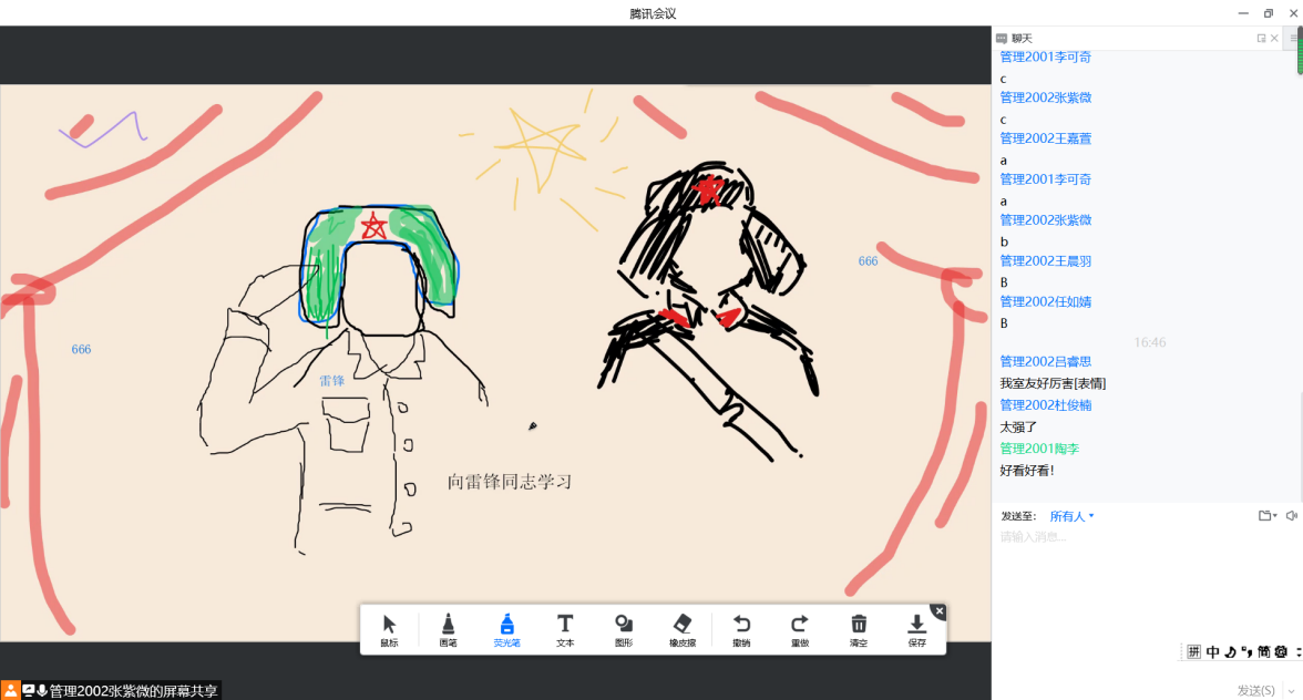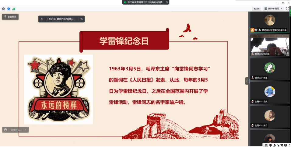 为全面贯彻党的十九大和十九届历次全会精神以及习近平总书记“七一”重要讲话精神,加强对广大青年的政治引领,引导广大青年自觉坚持党的领导,管理2001和管理2002团支部于3月25日,在线上开展以“奥运精神催奋·进学习雷锋启新程”为主题的团日活动。班导师张翠华、辅导员王守智应邀出席,本次活动两支部成员全部参加。