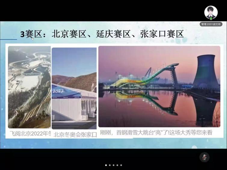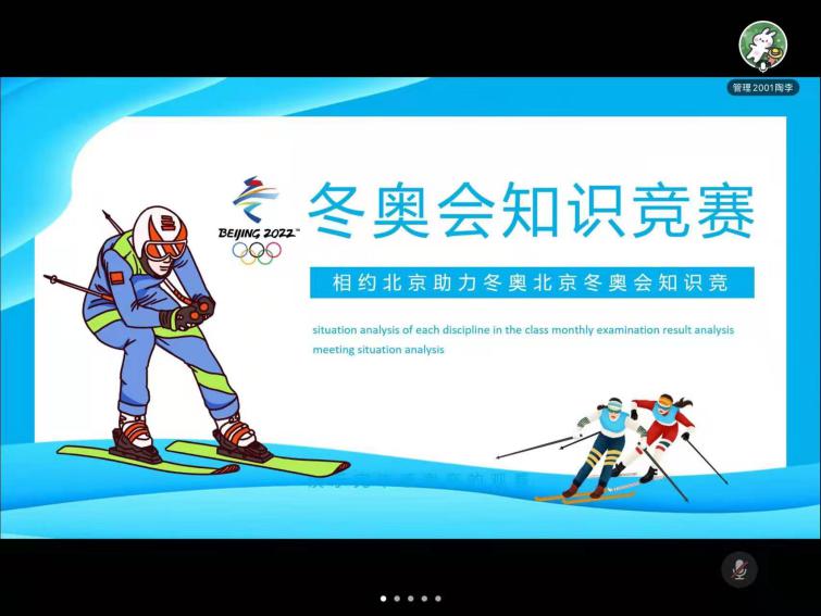 团支书首先向支部成员们介绍了冬奥城市的选择、办赛理念、办赛口号和办赛场地等基本信息,并带支部成员重温了令人难忘的开幕式,支部成员分享了自己了解的冬奥项目,支部成员们踊跃参加。随后团支书组织大家一起通过冬奥知识答题等方式深入学习了解冬奥。
