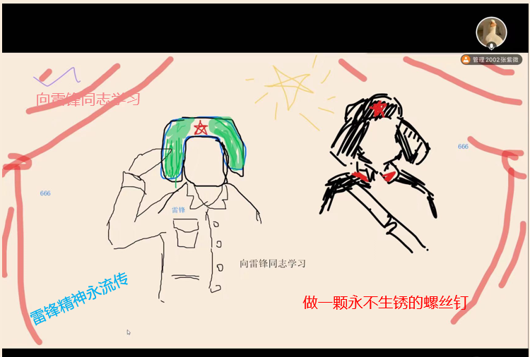 团支书张紫微向大家介绍了雷锋纪念日的由来和雷锋同志的简介,并带领支部成员开展小活动——画笔下的雷锋,同学们在屏幕上画出自己心中的雷锋,写下想对雷锋说的话。