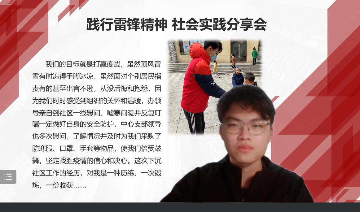 在“学习雷锋精神,策马扬鞭启新程”模块中,李敬骁同学分享了假期中参与 “践行雷锋精神”主题社会实践活动的故事。支部成员领悟了雷锋精神在抗疫活动中的重要作用,学会了把雷锋精神融入到日常的学习生活中去,从眼前做起、从小事做起,弘扬雷锋精神。