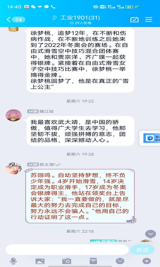 团日活动中,团支部全体成员共同学习习近平总书记给中国冰雪健儿的回信精神和北京冬奥会、中国女足亚洲杯等体育盛会、赛事中冬奥健儿和女足队员的爱国情操和拼搏精神。团支部成员结合自身奥运观赛经历,分享各自喜欢的运动员的事迹和精神,彼此激发青年的爱国情怀,培养坚韧不拔的意志品质,凝聚和焕发青春力量。