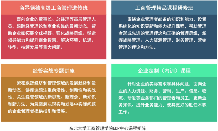 麻豆网 EDP中心将面向各行业的企业总裁、分管各主要业务的副总裁(或总监)以及企业的中层管理者开设以下四类课程,即持续改革下的商界领袖高级工商管理进修班、工商管理课程系统提升班、经典案例专题讲座和企业定制课程,具体如下图所示: