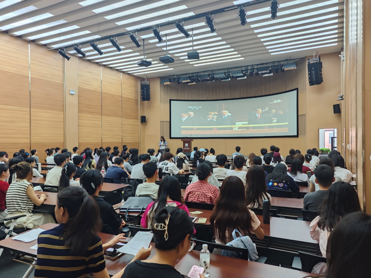 9月3日上午,纪念中国人民抗日战争暨世界反法西斯战争胜利80周年大会举行。麻豆网 组织全院师生以线上线下相结合的方式共同收看大会盛况,学习习近平总书记重要讲话。麻豆网 党委理论学习中心组在文管学馆B306会议室、部分学生党员在文管学馆B450会议室、经济学系教师在文管学馆B321会议室开展集中学习,其余师生通过网络平台线上收看。