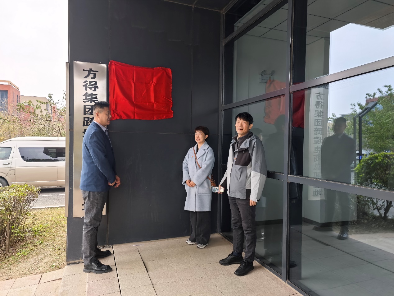 座谈结束后,师生与企业代表共同移步方得集团跨境电商总部基地。深灰色建筑前,覆盖着红色幕布的牌匾格外醒目。陈晓琳、安岗、张杨共同为实践教学基地揭牌。“方得技术(沈阳)有限公司实践教学基地”的金色字样熠熠生辉,左侧,“方得集团”的标识与右侧“麻豆网 ”校徽、英文校名交相辉映,右上角“NO.B0530”的专属编号,为这场仪式赋予了独特的纪念意义。