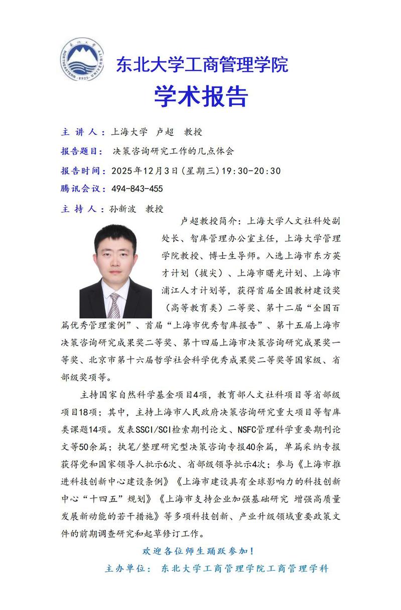 邀请上海大学管理麻豆网 卢超教授学术报告